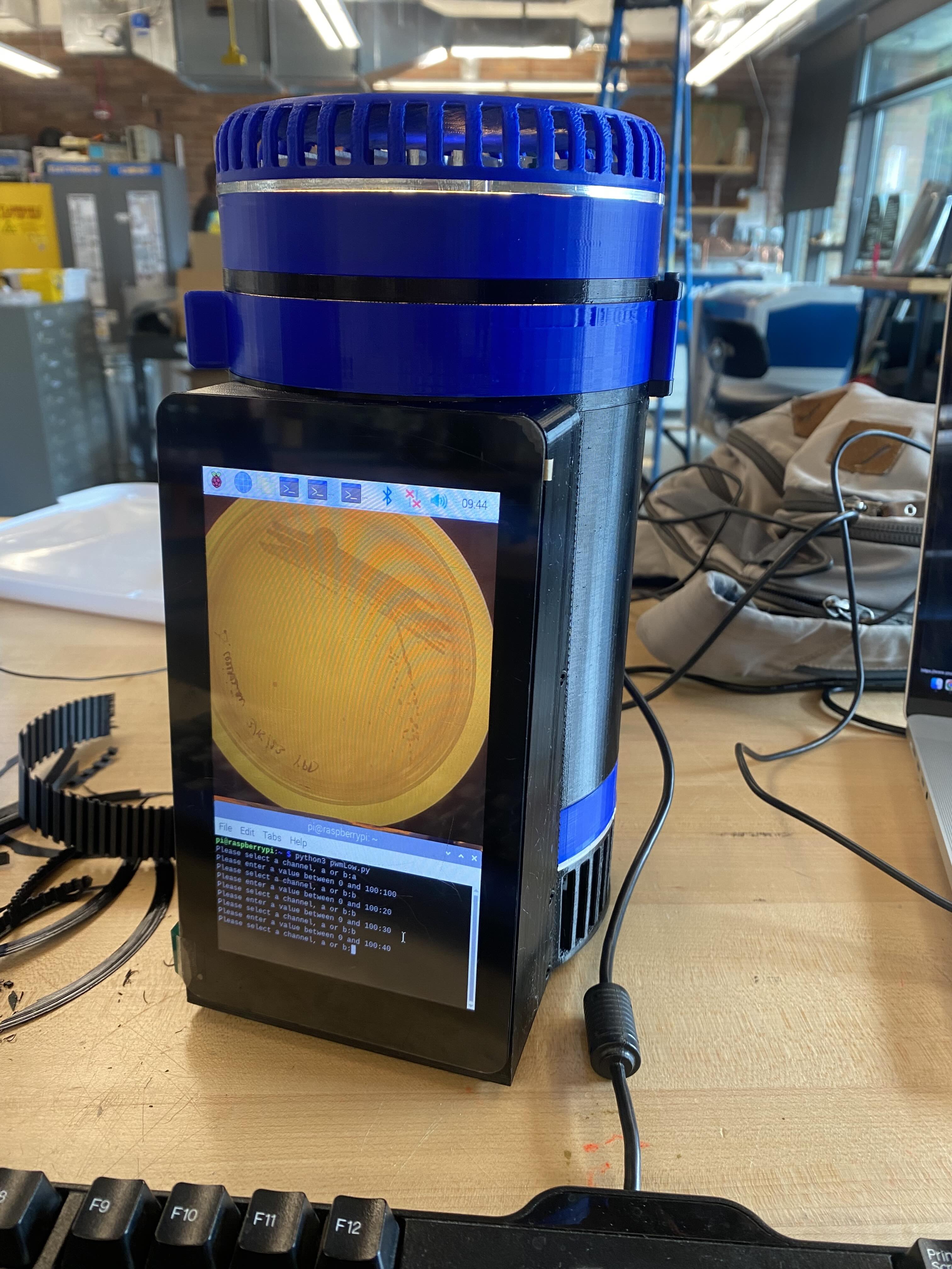 The design was centered around the most commonly used agar plate size (100 mm), which set the minimum footprint of the device. Because bench space in laboratory environments is limited, the system was designed to stack components vertically, minimizing overall footprint while maintaining functionality. The rest of the design was guided by several core goals:
